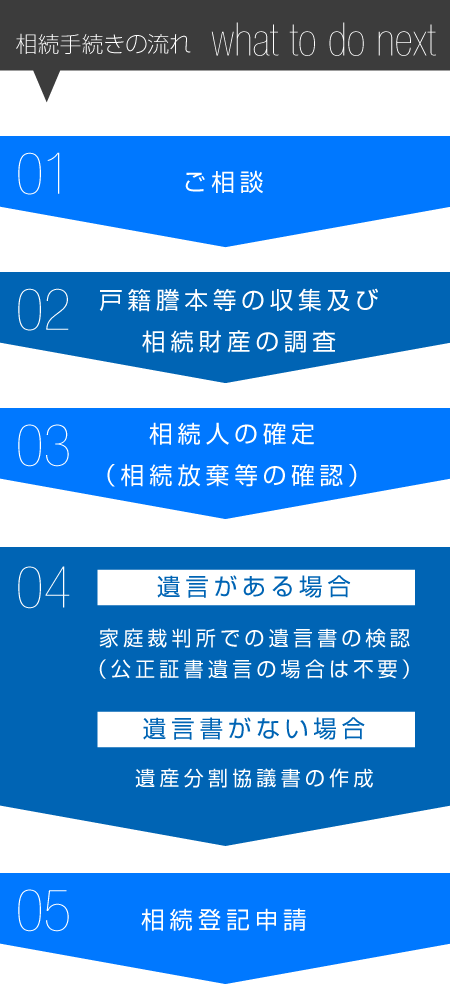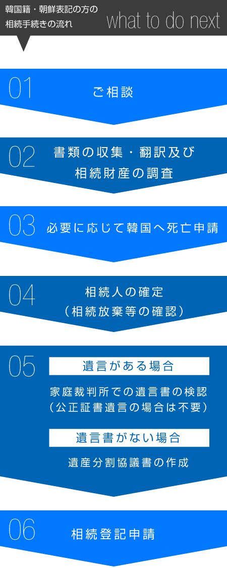 ■不動産登記について 不動産の登記手続だけでなく、紛争を事前に防止するための契約書作成など法的サービスをご提供しております。 詳しく見る 費用について 費用 (報酬・実費) 住宅ローンを完済したとき(抵当権抹消)【報酬(税別)】 9,000円~ * 不動産の数により加算があります。 【実費】 登録免許税 1,000円×土地・建物の数住所等を変更したとき【報酬(税別)】 10,000円~ * 不動産の数により加算があります。 住民票等の取得 1通2,500円 【実費】 登録免許税 1,000円×土地・建物の数不動産を売買するとき(所有権移転)【報酬(税別)】 50,000円~ 立会い・原因証明情報作成含む * 不動産の数や評価額により加算があります。 固定資産税評価証明書、住民票等の取得 1通2,500円 【実費】 登録免許税 土地の評価額×15/1000 建物の評価額×20/1000 報酬表は、全て税抜き価格です。 関係者が複数の場合は加算される場合があります。 いずれも実費が別途かかります。 報酬基準表に当てはまらない場合は、お見積りさせていただきます。 各種サービス料金一覧表はこちら ■相続・遺言について 相続登記は勿論のこと、相続の周辺業務をトータルでサポートします。想いが伝わる遺言書の作成や、相続手続きの解決をお手伝いいたします。 詳しく見る 費用について 費用 (報酬・実費) 不動産を相続したとき(相続による所有権移転登記)【報酬(税別)】 35,000円~ * 不動産の数や相続人の人数によって加算があります。 * 戸籍謄本等の書類取得は1通につき2,500円 * 相続関係説明図作成 5,000円~ * 遺産分割協議書作成 10,000円~ * 戸籍調査業務は別途加算 * 外国籍の方の場合は、別基準になります。 【実費】 登録免許税 不動産の評価額×4/1000 取得書類の実費等(例:戸籍謄本1通450円、除籍謄本1通750円) 報酬表は、全て税抜き価格です。 いずれも実費が別途かかります。 報酬基準表に当てはまらない場合は、お見積りさせていただきます。 各種サービス料金一覧表はこちら ■韓国・朝鮮籍の方の相続について 日本の法律だけでは解決できない韓国・朝鮮人の相続を、経験豊富な司法書士が解決いたします。 詳しく見る 費用について 費用 (報酬・実費) 相続登記【報酬(税別)】 直系の方の相続の場合 180,000~ 韓国書類等の必要書類の収集・翻訳料含む * 不動産の数や相続人の人数によって加算があります。 【実費】 登録免許税 不動産の価格×4/1000 韓国戸籍・証明書 1通195円 報酬表は、全て税抜き価格です。 いずれも実費が別途かかります。 報酬基準表に当てはまらない場合は、お見積りさせていただきます。 各種サービス料金一覧表はこちら ■成年後見について 認知症などの影響によって判断能力が充分ではない方は、悪質商法などの被害者となるケースも考えられます。そうなる前に権利や財産を守る支援をいたします。 詳しく見る 費用について 費用 (報酬・実費) 成年後見開始の申立て【報酬(税別)】 成年後見申立 120,000円~ 【 実費】 印紙代等 約10,000円 医師の鑑定料 約50,000円~150,000円 報酬表は、全て税抜き価格です。 いずれも実費が別途かかります。 家庭裁判所の判断により、医師の鑑定料がかかる場合があります。 報酬基準表に当てはまらない場合は、お見積りさせていただきます。 各種サービス料金一覧表はこちら ■会社設立等について 会社の土台となる設立登記や役員の変更登記、事業承継などの企業支援を通して、会社だけでなく、一人で問題を抱えがちな会社社長の良き相談者として、企業を総合的にサポートします。 詳しく見る 費用について 費用 (報酬・実費) 商号・目的変更【報酬(税別)】 26,000円~ 【実費】 登録免許税 各3万円役員変更【報酬(税別)】 15,000円~ 【実費】 登録免許税 1万円 (資本金1億円以下の会社の場合)株式会社の設立【報酬(税別)】 100,000円~ * 定款作成、添付書類作成、公証人役場での定款認証を含みます。 【実費】 公証人費用 約52,000円 登録免許税 資本金の0・7%(最低15万円) 報酬表は、全て税抜き価格です。 実費が別途かかる場合があります。 報酬基準表に当てはまらない場合は、お見積りさせていただきます。 各種サービス料金一覧表はこちら ■裁判・離婚について 身近なお金の貸し借りから家賃や敷金、契約、職場のトラブル、悪質商法の被害、夫婦間の問題など、日常生活の中では様々な困りごとが起こることがあります。法務大臣認定司法書士が、解決をお手伝いいたします。 詳しく見る 費用について 費用 (報酬・実費) 裁判事務【報酬(税別)】 訴訟: 着手金 80,000円~ 成功報酬 経済的利益の10% 訴状・答弁書等の書類作成: 50,000円~ 【実費】 切手代・収入印紙・登記簿謄本などの費用がかかります。 報酬表は、全て税抜き価格です。 報酬基準表に当てはまらない場合は、お見積りさせていただきます。 裁判・離婚については、着手金、成功報酬及び実費が依頼者様の負担となります。 訴訟の代理は、簡易裁判所における訴額140万円以下の民事訴訟に限ります。 各種サービス料金一覧表はこちら ホーム 業務内